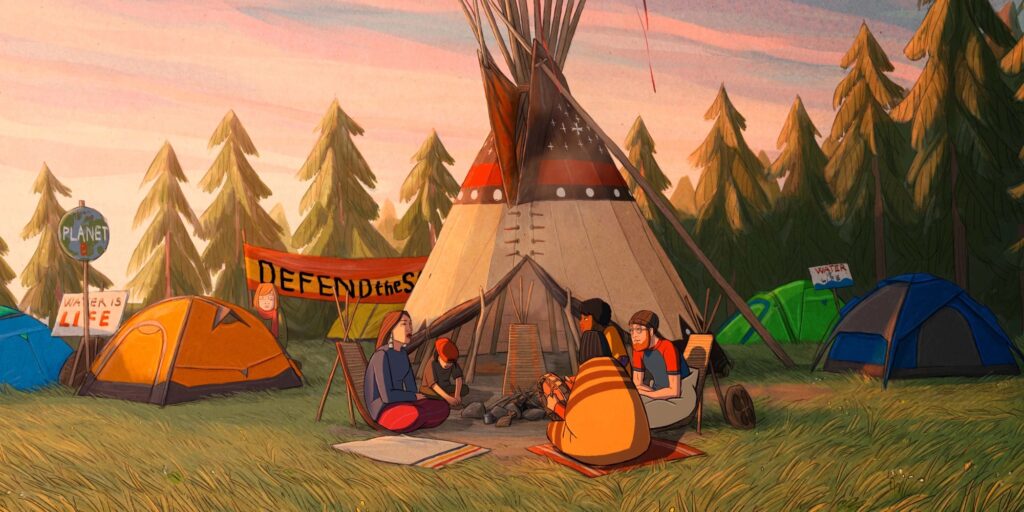 Des activistes amérindiens s’opposent à un projet d’oléoduc sur leur territoire ancestral. Le soir autour du feu, ils se réunissent autour de leur Grand-Père qui leur fait le récit de la Création. Le conte rappelle à tous la place de l’Homme sur la Terre et son rôle dans la destruction de la nature.